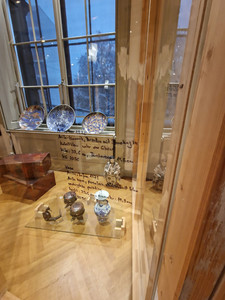 A collection of ceramics was displayed by using the ceramics to support a pane of glass creating a table on which more ceramics were displayed which I thought was original in terms of curatorship. The exhibit labels were hand written using felt tip pen on the display glass.